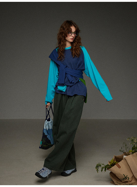 ブロックカラー ショルダースリーブ 丸首長袖Tシャツ