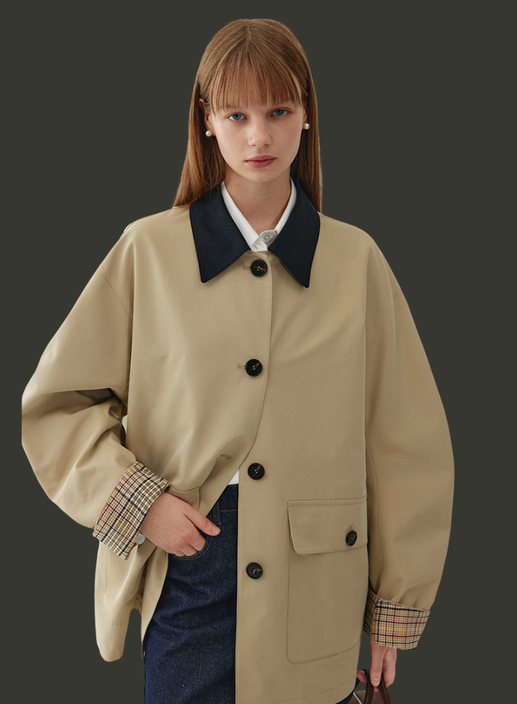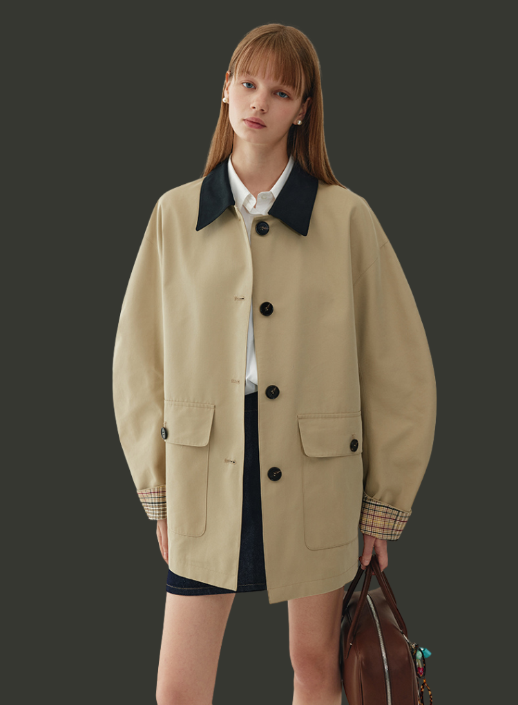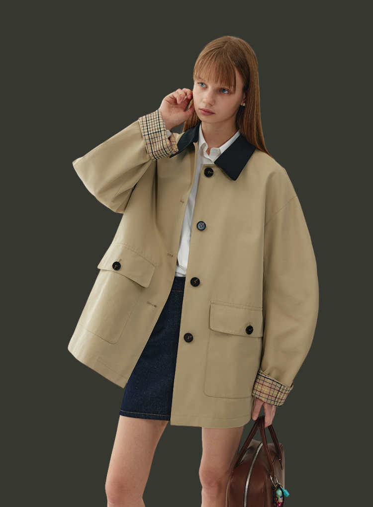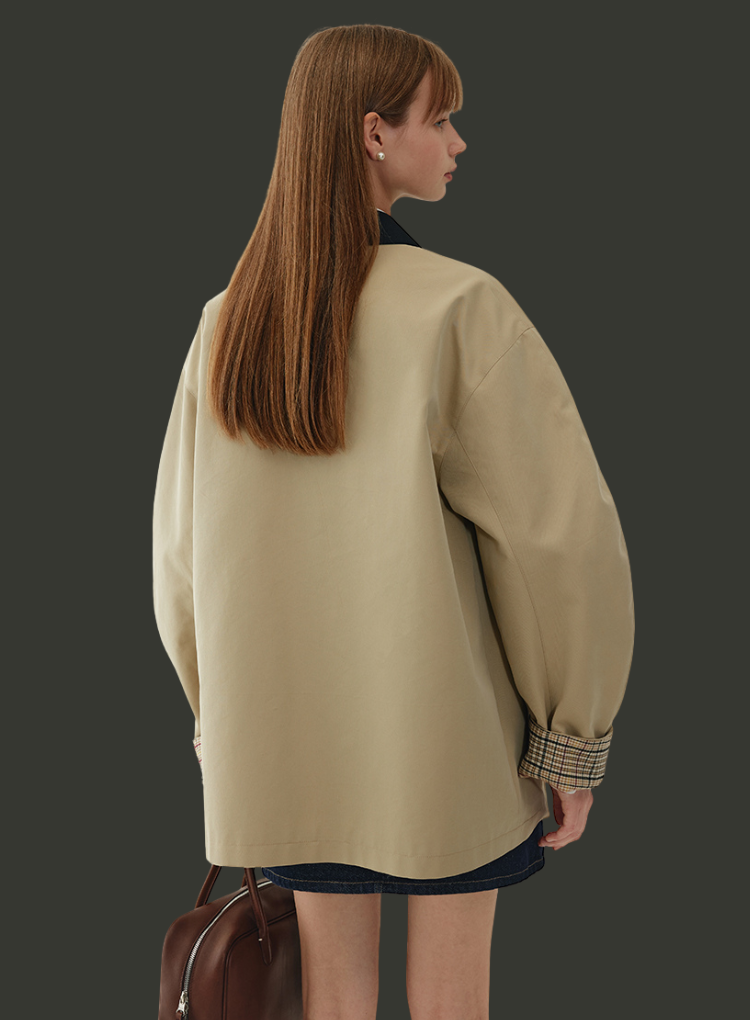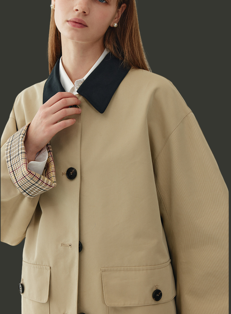 デザイン:バイカラー配色、比翼ボタン、チェック裏地付き、両サイドポケット