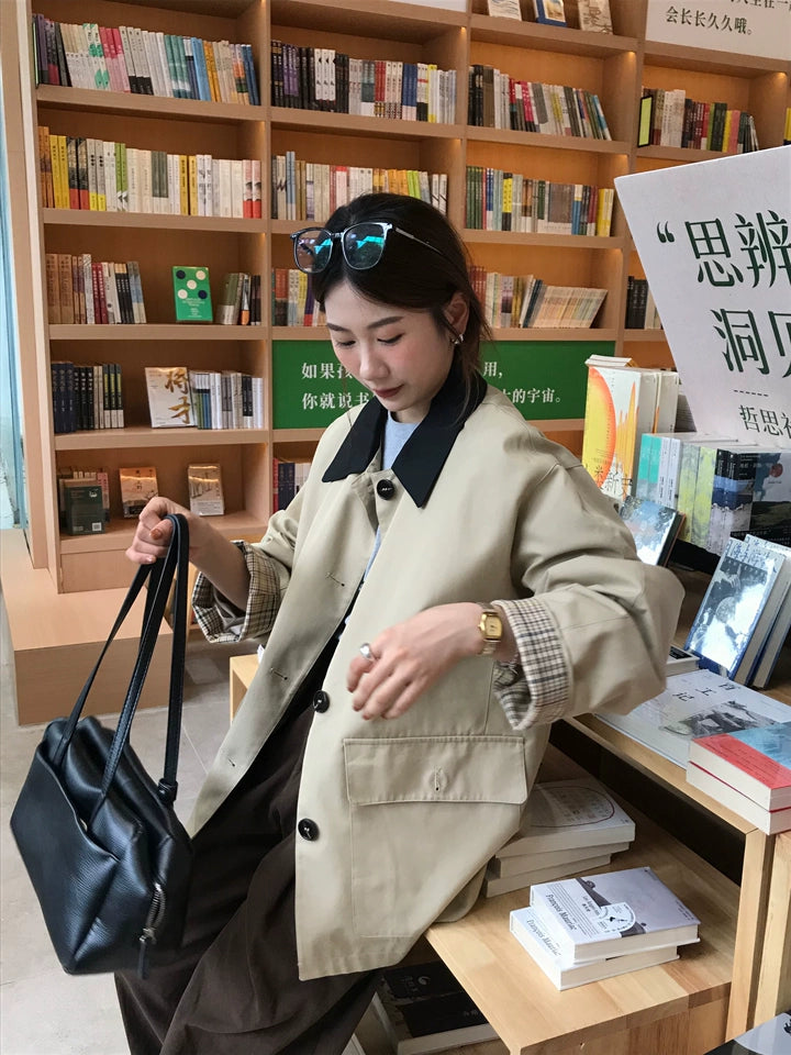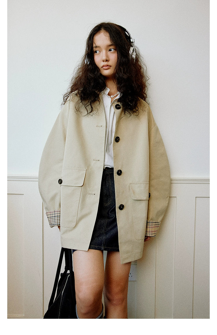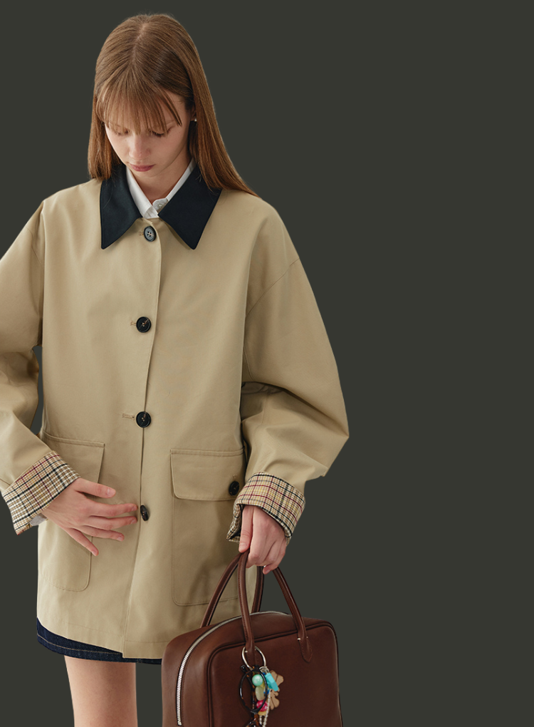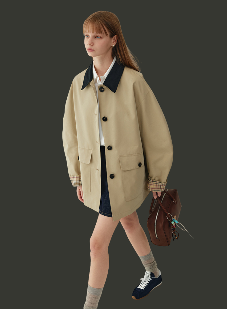 デザイン:バイカラー配色、比翼ボタン、チェック裏地付き、両サイドポケット