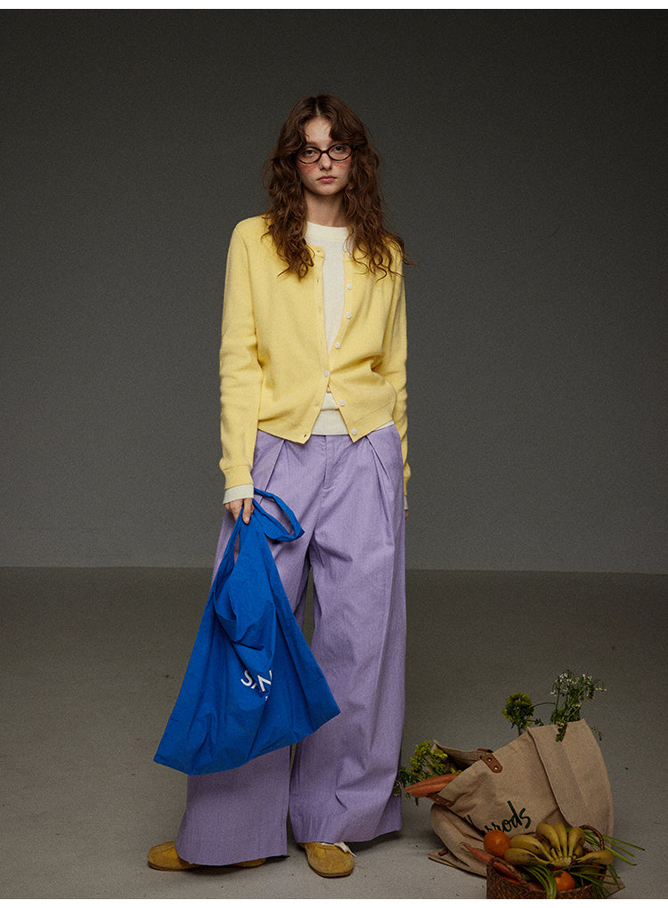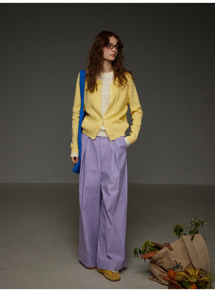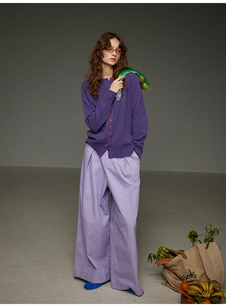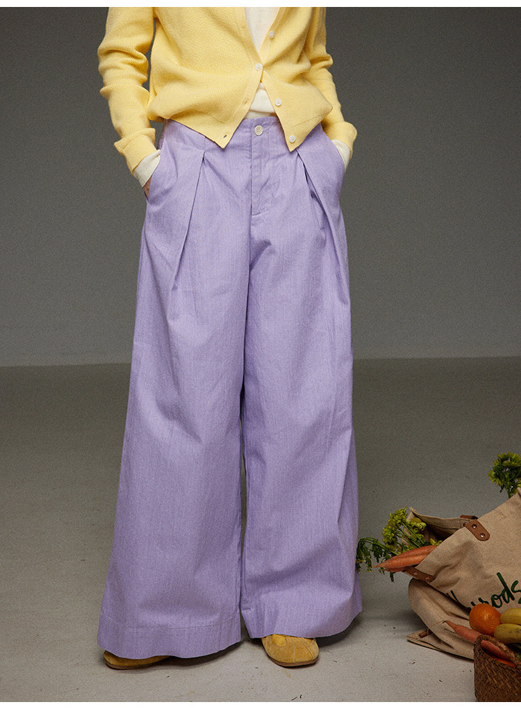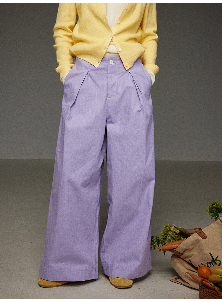 落ち着きのあるパープルカラーが特徴的な、レトロな雰囲気漂うハイウエストワイドパンツです。ゆったりとしたシルエットでありながら、ハイウエスト設計により脚長効果を演出します。