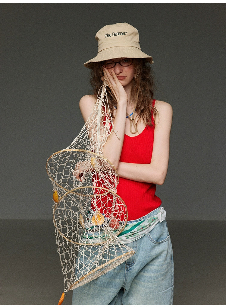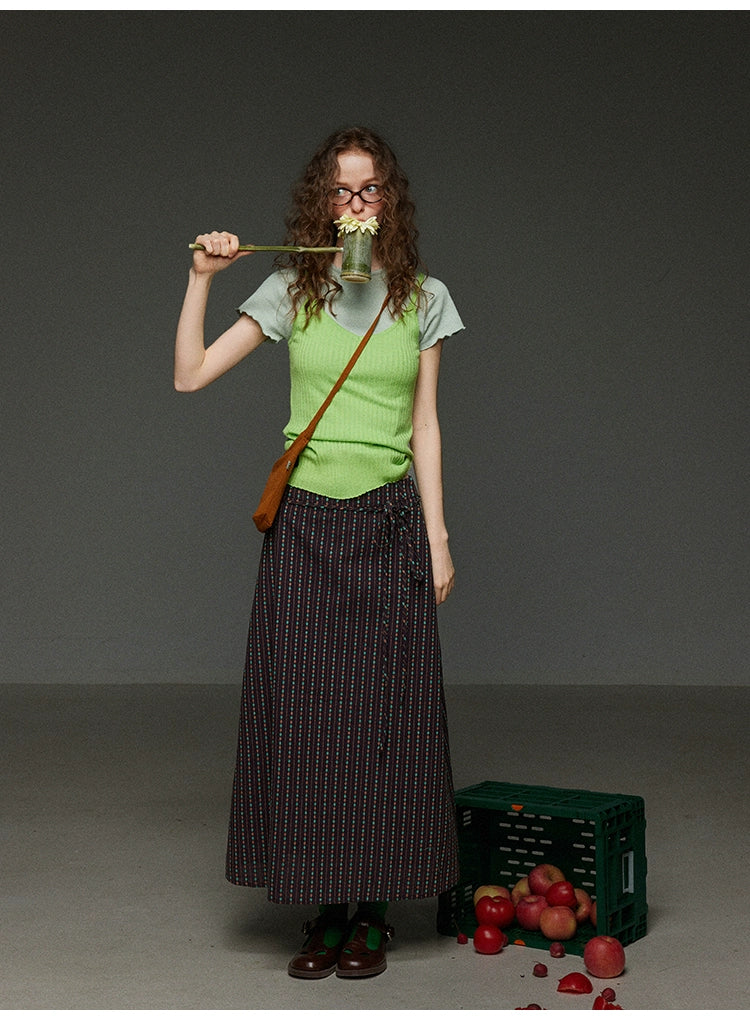 レトロな配色とストライプ柄が目を惹く、夏仕様のニットベスト。