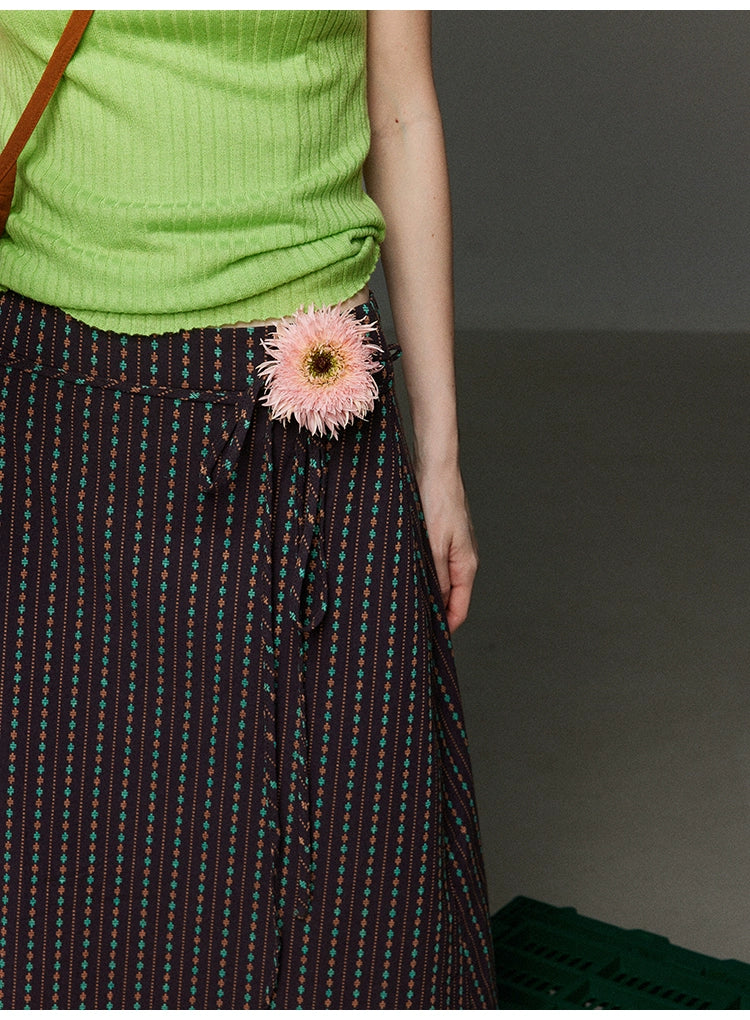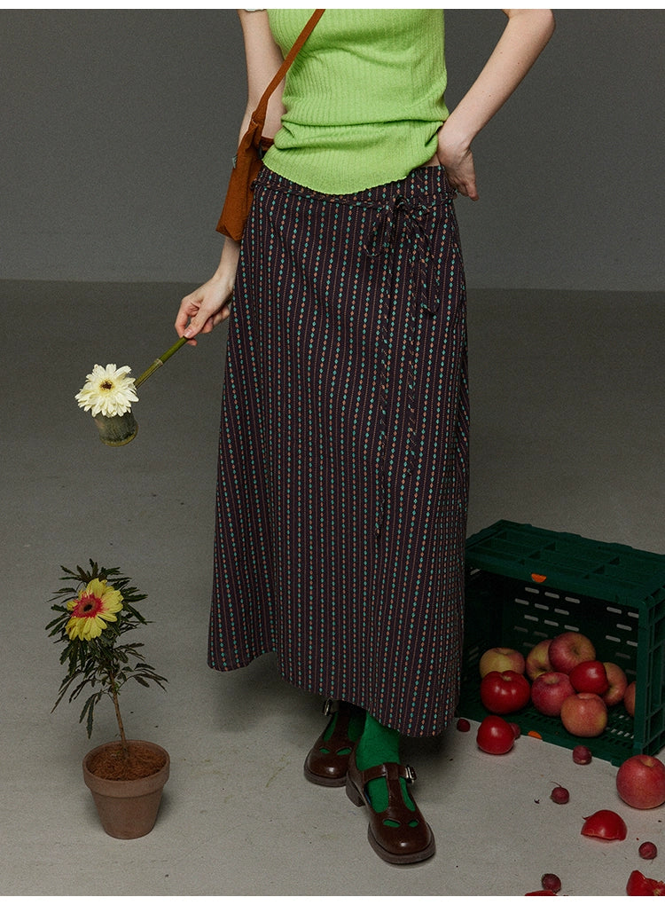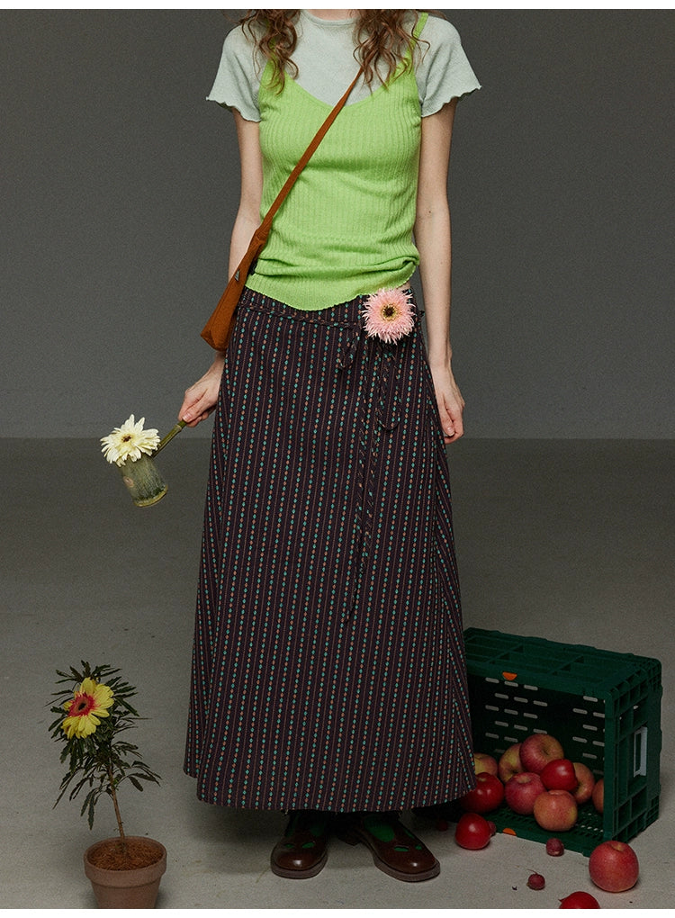 【縦縞ネクタイ花柄スカート|ストレートスリムAラインロング】