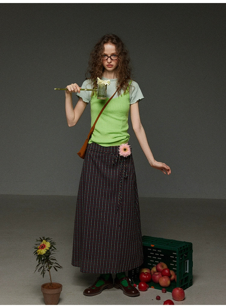 ユニークな縦縞×小花柄が印象的な、目を惹くストレートシルエットのAラインスカート。