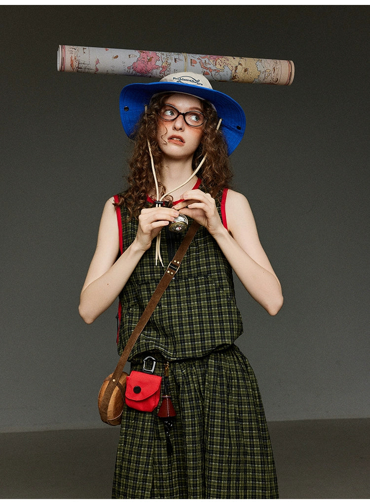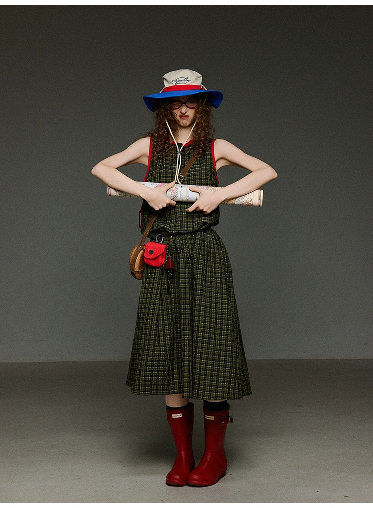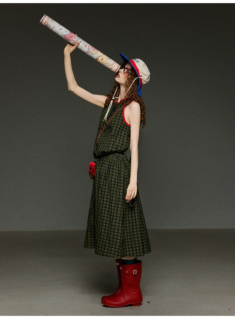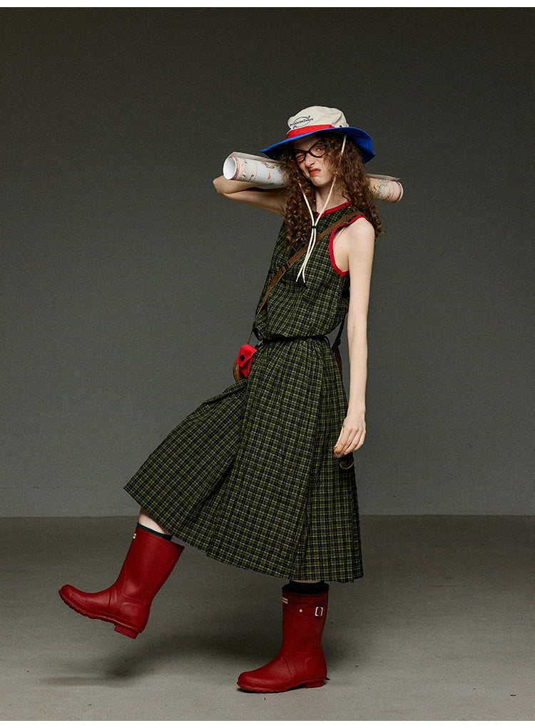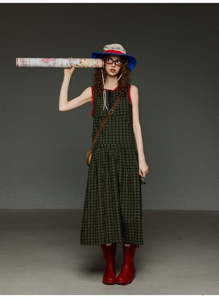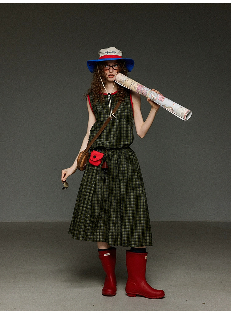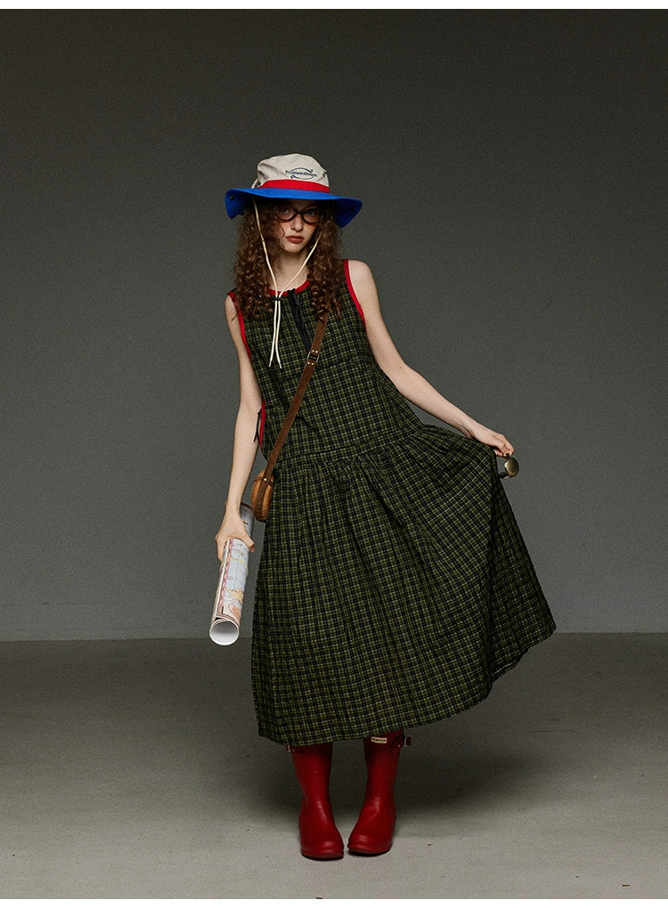レトロなグリーンのチェック柄に、赤の配色パイピングを効かせたデザインが魅力のAラインノースリーブワンピース。