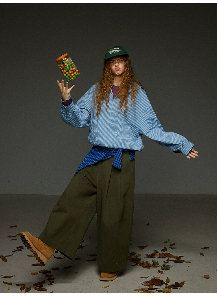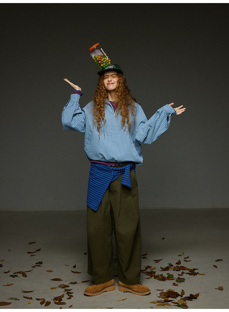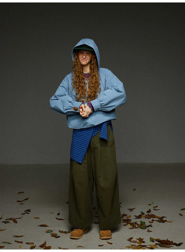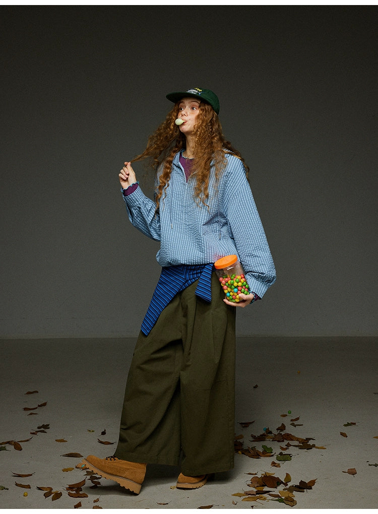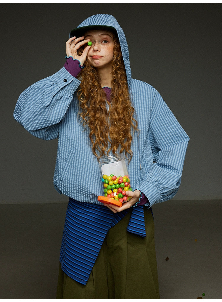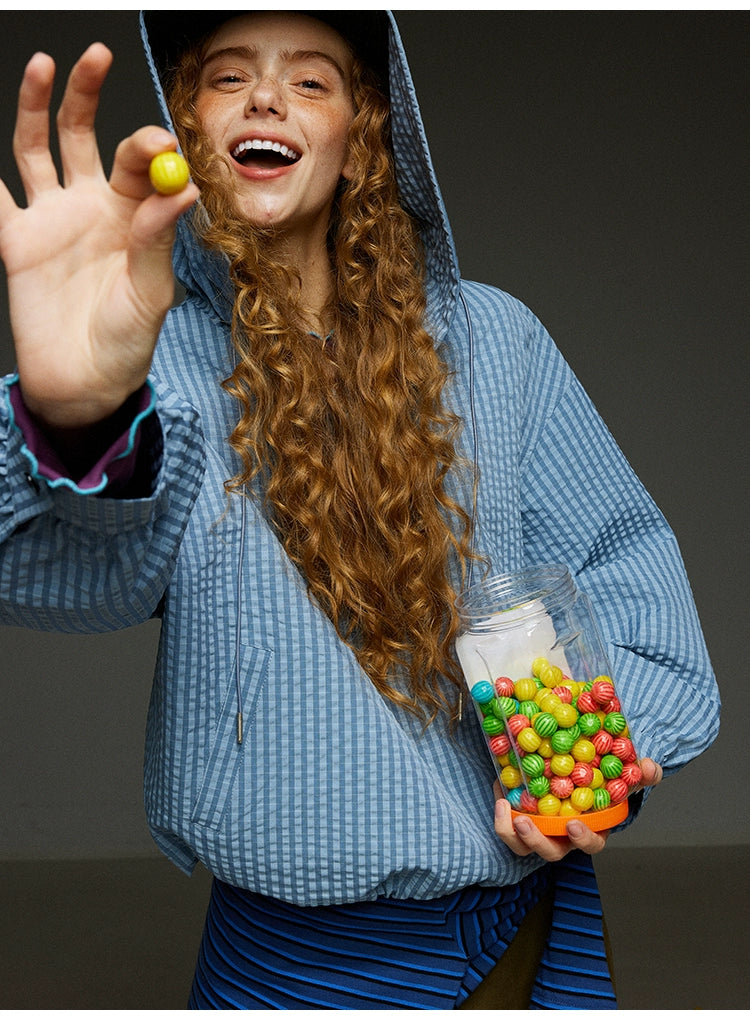 くすみブルーのチェック柄とセミジップが印象的な、ルーズシルエットのショートアウター。