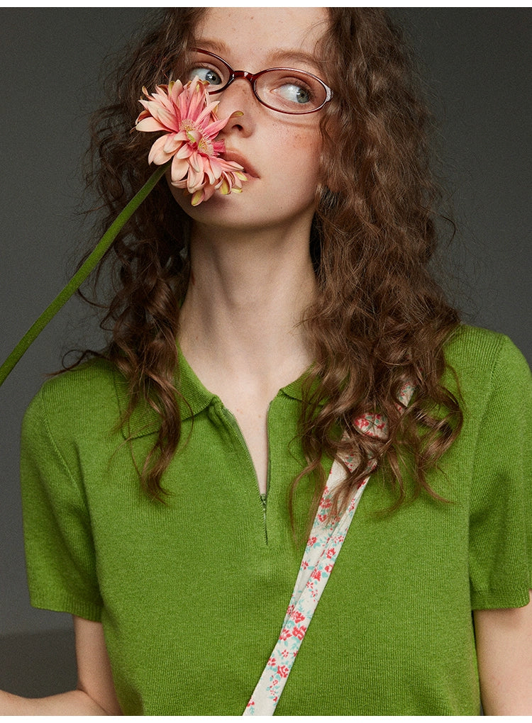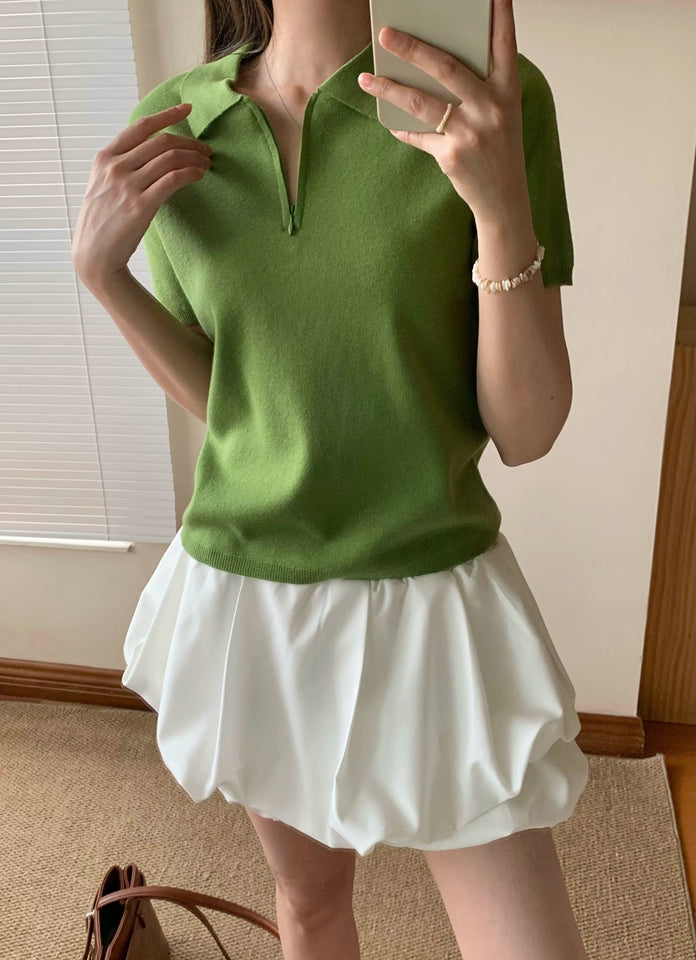 立体感のあるリブ編みと、首元のジップデザインが印象的なサマーニットトップス。